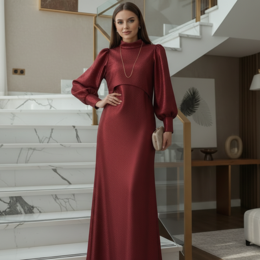 Shine at your next event with this stunning, light-catching ensemble that combines modest elegance with high-fashion shimmer.